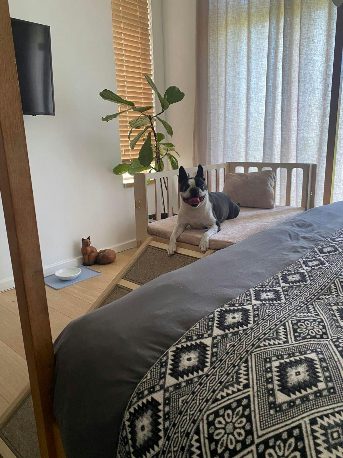 Introducing the Bedside Dog Bed - thoughtfully designed for small to medium sized dogs who love to sleep close to their humans without taking over your bed.